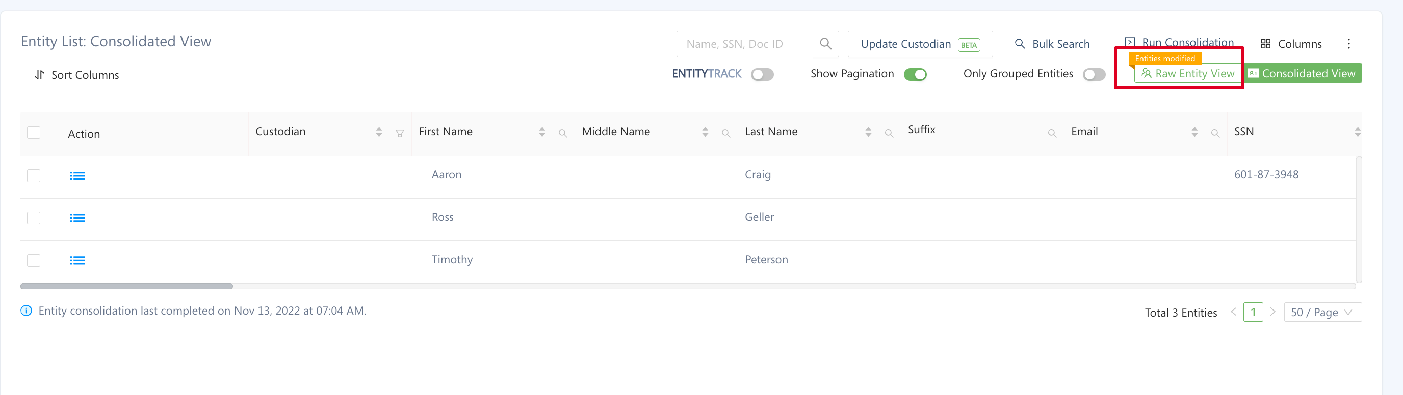A badge appears around the Raw Entity button when raw entities have been added or modified since the last consolidation run.