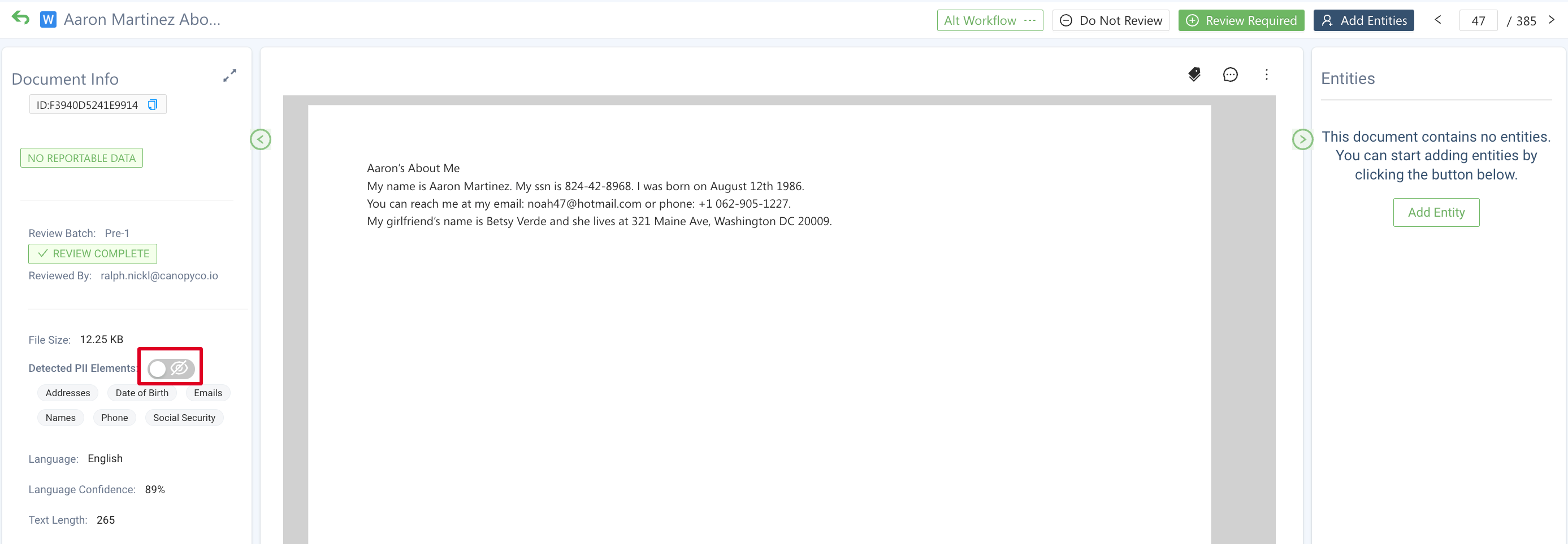 Turn off highlighting of Detected PII and Custom Elements on a page-by-page basis.