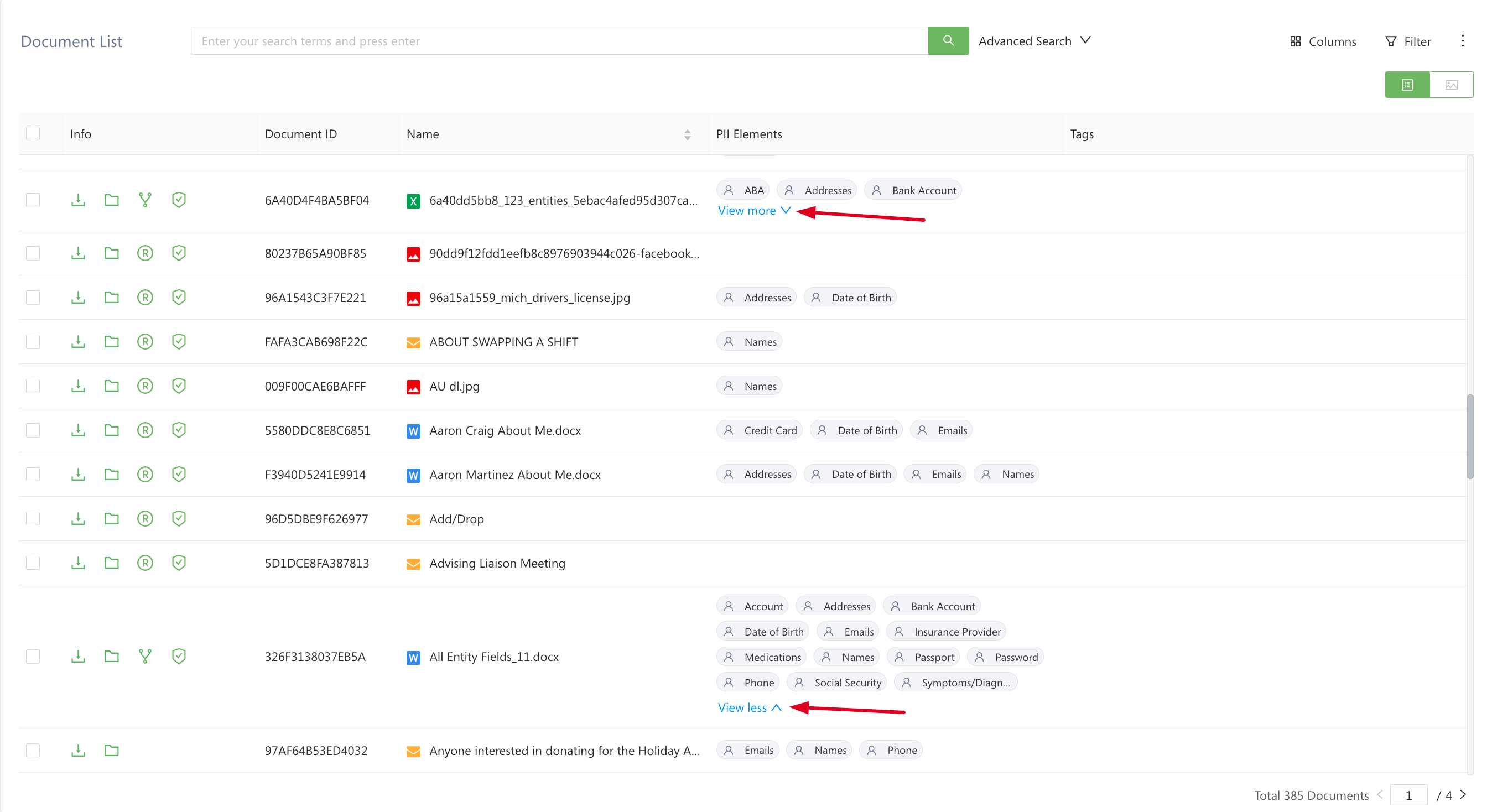 Document list rows are now fixed height so more documents can be listed on the screen. Select View More or View Less to expand a row.